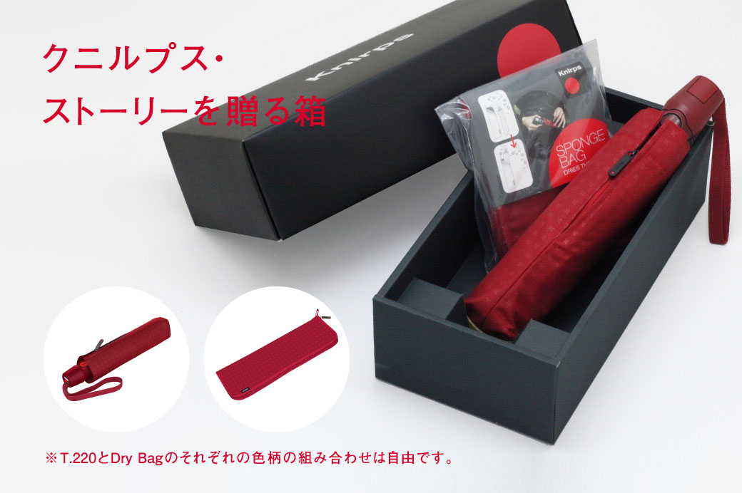 クニルプス ニューラインT.220 Trusty Red(トラスティ・レッド)の発売を記念して、人気商品「T.220」と、濡れた傘の持ち運びに便利な「Dry Bag」をお好きな組み合わせでギフトにすることができる特別な箱をご用意しました。 誕生日、記念日、お祝い、お礼など大切な方へのプレゼントにいかがでしょうか? セット用ギフト…